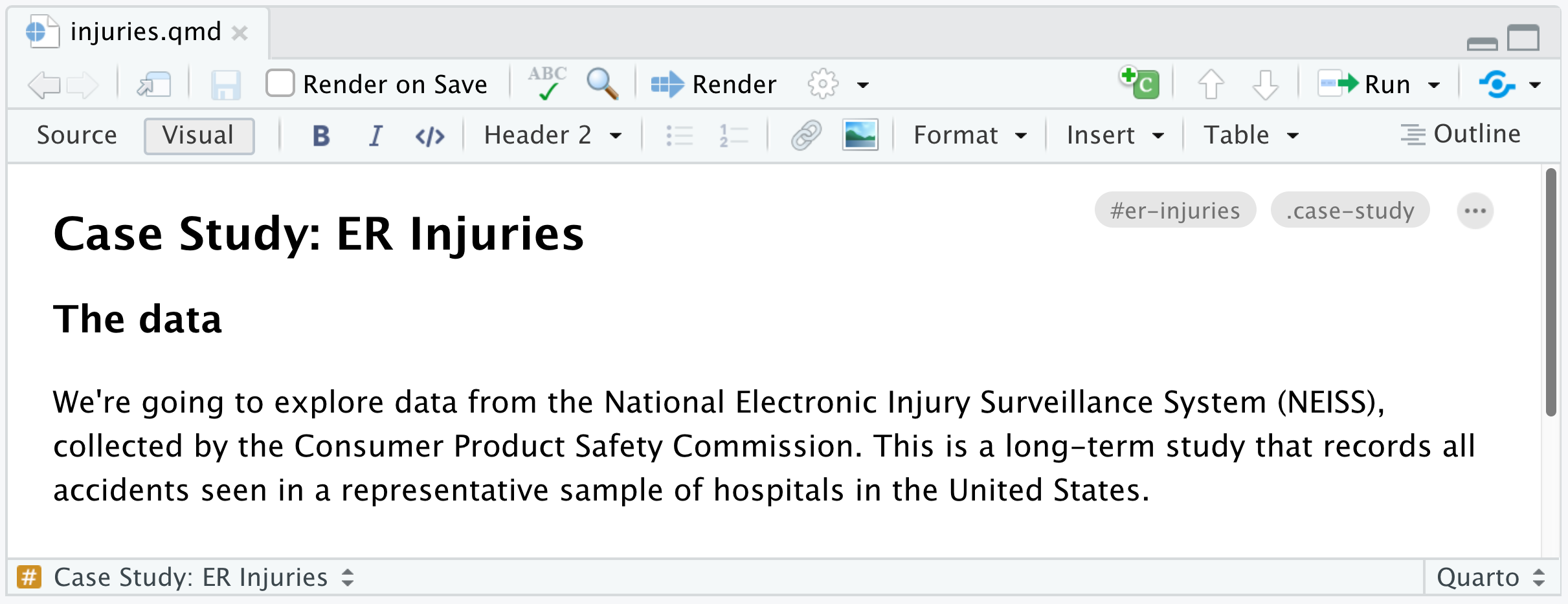 Visual mode supports editing all of Pandoc markdown. Standard formatting commands (headings, bold, italic, etc.) work just the way they do in a conventional word processor.