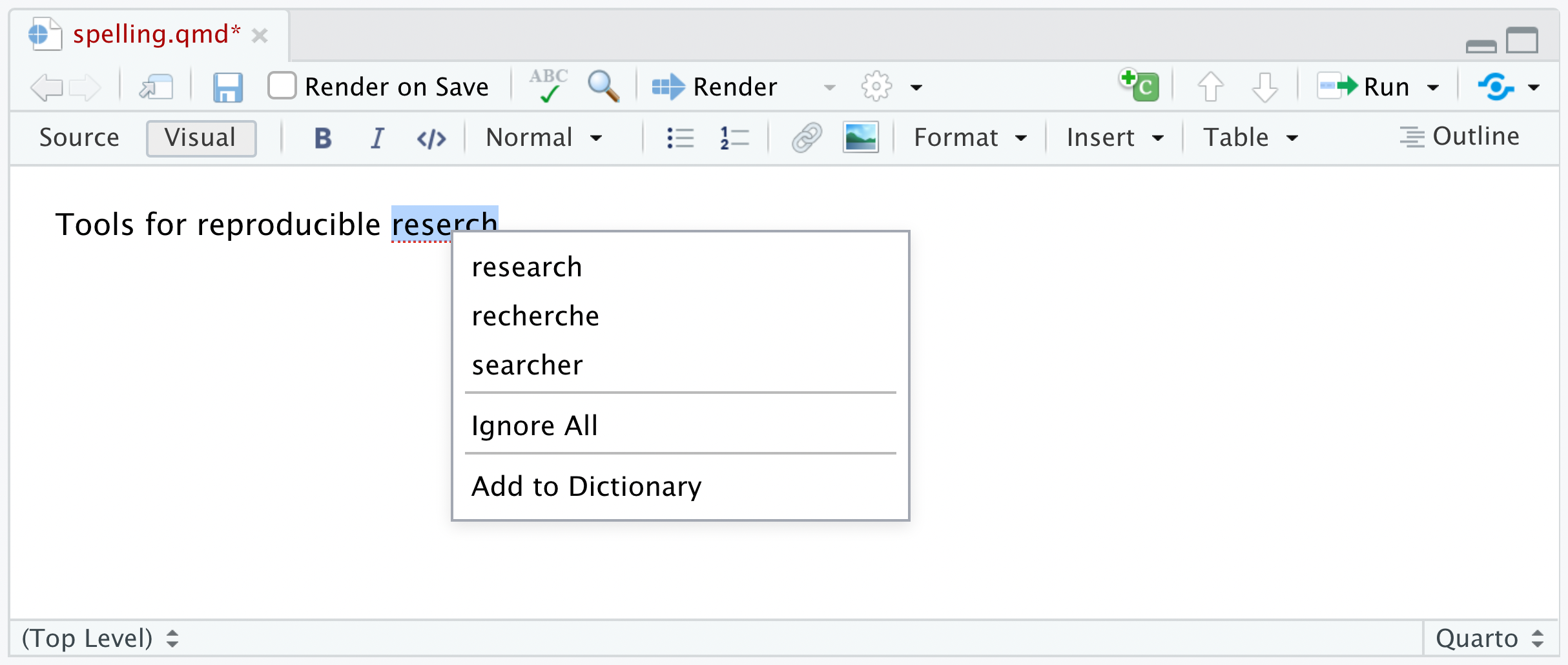 When RStudio real time spell-checking is enabled (you can do this using Spelling preferences), misspelled words will be underlined as you type: